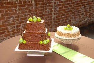 Sommer had asked for her cake to be chocolate with chocolate buttercream icing. Johnny's cake was carrot cake with cream cheese icing. I incorporated chocolate twigs and gumpaste apples into the design of the cakes, to tie in with the table centerpieces.